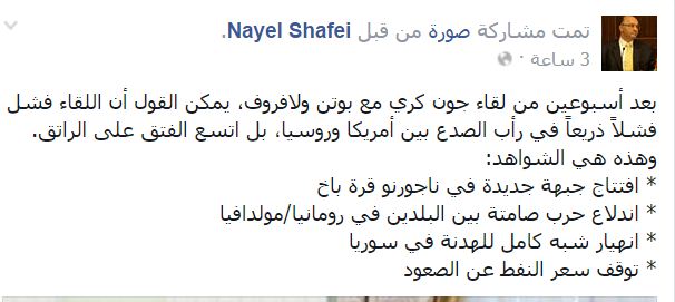 قال نائل الشافعي، مدير الموسوعة الإلكترونية “معرفة”، إن اللقاء الذي جمع بين وزير الخارجية الأميركي، جون كيري، مع نظيره الروسي سيرجي لافروف، والرئيس الروسي فلاديمير بوتين، فشل في رأب الصدع بين أميركا وروسيا.
