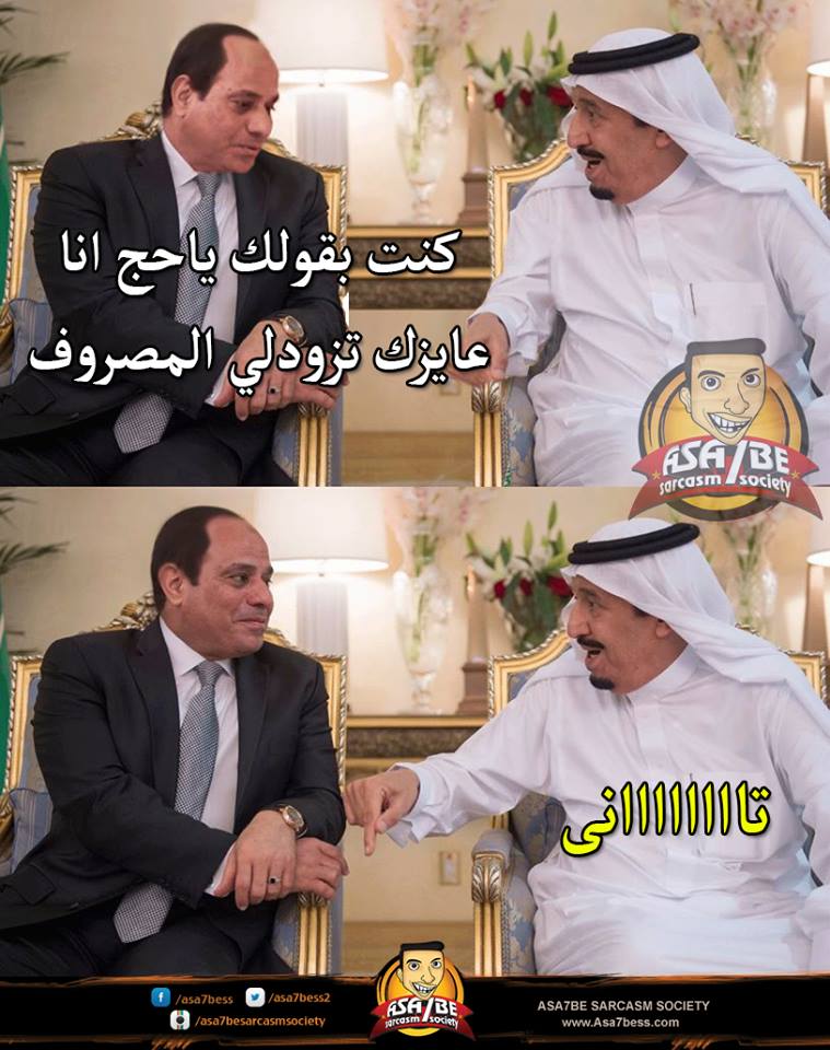 ومع زيارة العاهل السعودي لمصر اليوم، الذي قال السيسي عنه في التسريبات المشهورة “عندهم فلوس زي الرز”، وجدت صفحات “الكوميكس” والفيديوهات الساخرة على مواقع التواصل الاجتماعي مادة دسمة لـ”حفلة” ساخرة على السيسي بدأت من الصفحة الساخرة التي أقامها شخص تحت اسم “عبدالفتاح السيسي” عبر موقع التواصل الاجتماعي “فيس بوك” لتخيل الحديث باسمه، حيث علق على الزيارة قائلًا: “الملك سلمان لاعبني بلايستيشن وغلبني 3/1”.