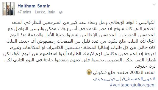 وكتب سمير، وهو صحفي مُقيم في إيطاليا، عبر حسابه الرسمي على موقع التواصل الاجتماعي “فيس بوك”: “الكواليس: الوفد الإيطالي وصل ومعاه عدد كبير من المترجمين للنظر في الملف الضخم اللي كان متوقع أن مصر تقدمه في أسرع وقت ممكن ولتيسير التواصل مع المحققين المصريين”.