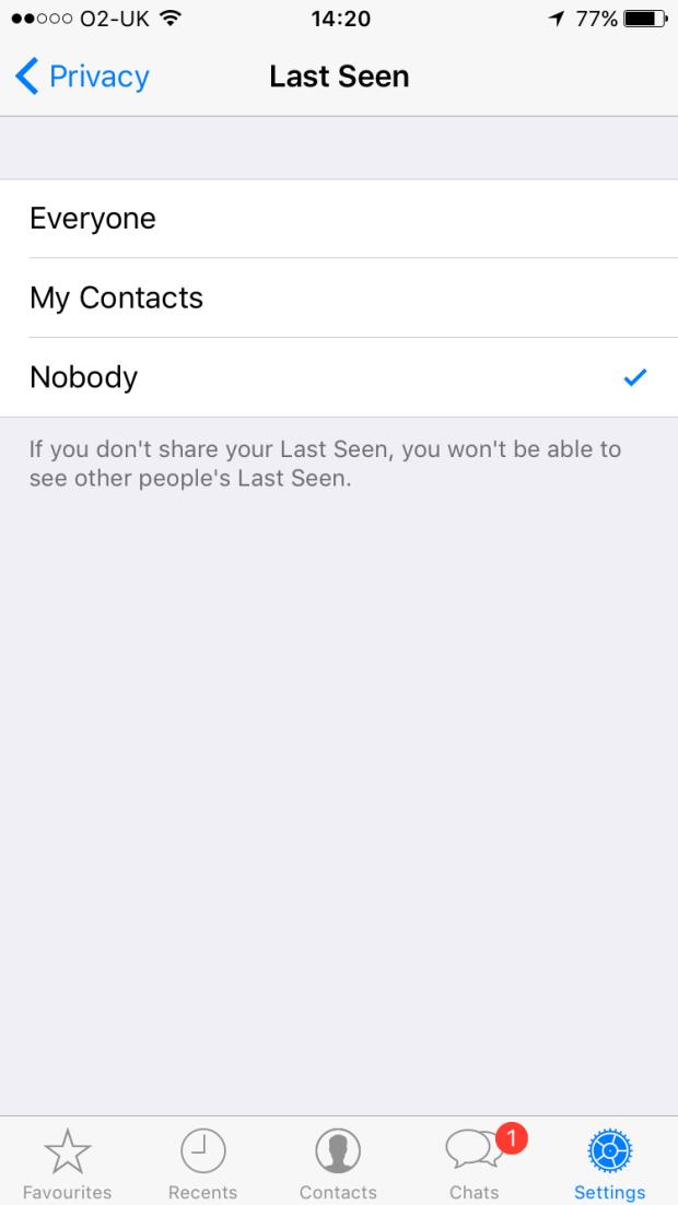 تجعل خاصيّة Last Seen الآخرين مُطلعين على نشاطك اليومي بشكل مُثير للإزعاج، وتتبّعك أينما كنت، ما يُمثّل تدخلًا سافرًا في خصوصيتك، ويُمكنك إيقافها، من خلال التوجّه إلى إعدادات الخصوصية، والضغط على Last Seen، لتقوم بالنقر على خيار Nobody.