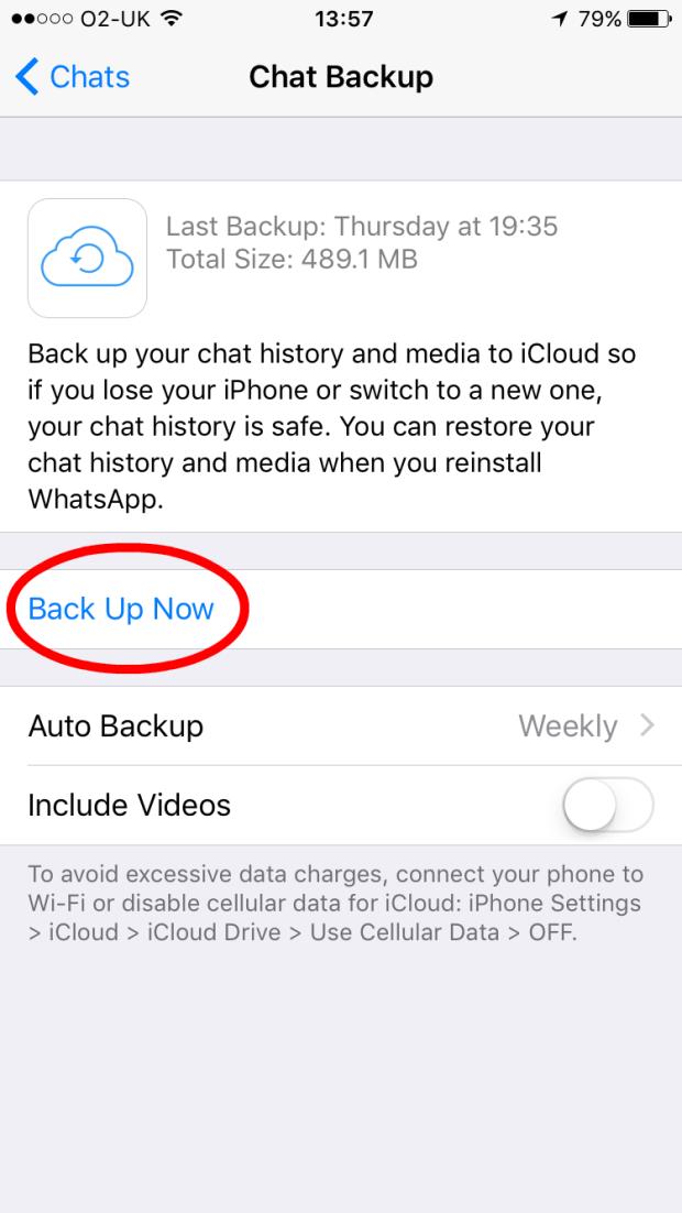 تلافيًا لفقد أي مُحادثة تقوم بإجرائها عبر التطبيق، عليك أن تحرص على إجراء نسخ احتياطي لكافة المُحادثات، عبر التوجُه إلى Settings ثم الضغط على Chats، حيث تجد خيارًا يخوّل لك إجراء عملية نسخ احتياطي في الحال back up chat history now، أو يُصبح أوتوماتيكيًا بتوقيت تقوم بتحديده Set up an auto-back up.