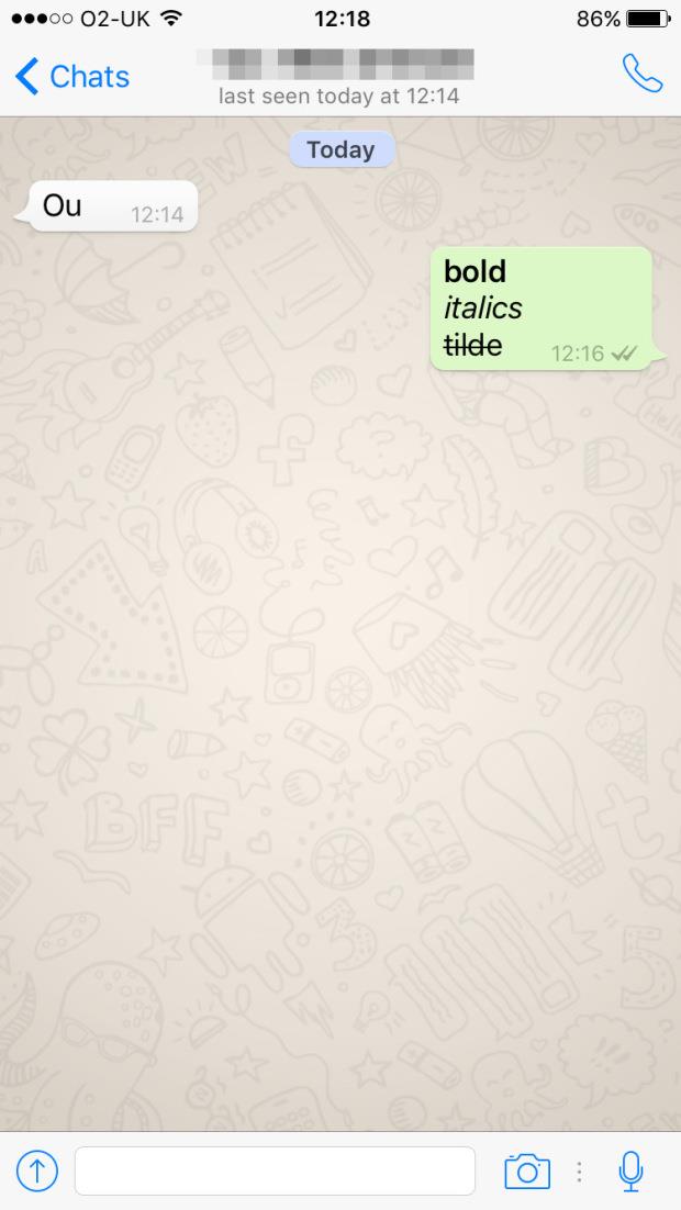 يُمكنك ضبط تنسيق خط النصوص التي تتبادلها على “واتس اب”، لتجعلها عريضة بوضع النص *بداخل نجمتين*، أو مائلة بإضافة _شرطتين سُفليتين_ أو جعلها تبدو مشطوبة بوشعها بين ~علامات التلدة~، كما يمكنك الجمع بينهم جميعًا في آن واحد، لإضفاء مزيدًا من التنوّع.