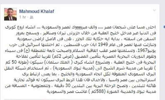 وقال -عبر منشور له على “فيس بوك”-: “ألف مبروك لمصر والسعودية، إنشاء أروع كوبري في الدنيا، عبر مدخل خليج العقبة”.