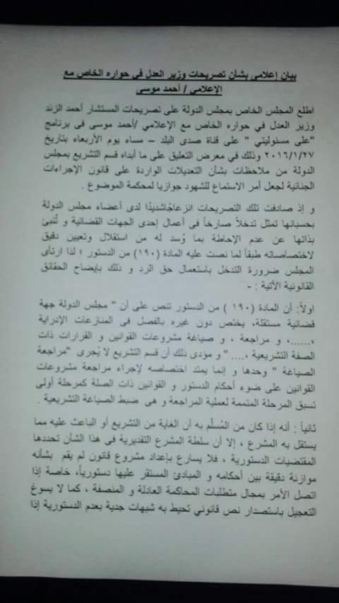قال مجلس الدولة، إنه اطلع على تصريحات المستشار أحمد الزند، وزير العدل السابق، في حواره مع مقدم البرامج أحمد موسى، عبر برنامج “على مسؤوليتي” على قناة “صدى البلد”، في معرض التعليق على ما أبداه قسم التشريع بمجلس الدولة من ملاحظات بشأن التعديلات الواردة على قانون الإجراءات الجنائية لجعل أمر الاستماع للشهود جوازيًا لمحكمة الموضوع.