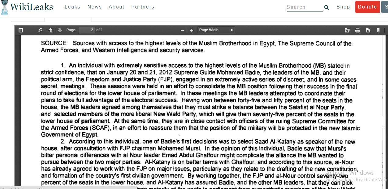 وقالت الوثيقة إن أحد المصادر الحساسة أكد بثقة كاملة أنه في يوم 20 و21 من يناير عام 2012، عقد المرشد العام للإخوان المسلمين سلسلة اجتماعات سرية مع قادة الإخوان المسلمين و”الحرية والعدالة”، هدفت هذه الاجتماعات إلى تعزيز مكانة الإخوان في أعقاب نجاحهم في الجولة الأخيرة من انتخابات مجلس النواب، وخلال هذه الاجتماعات حاول قادة الإخوان تنسيق الخطط للاستفادة الكاملة من النجاح الانتخابي، وفي الوقت نفسه فإنهم على اتصالات وثيقة مع ضباط المجلس العسكري الحاكم في مسعى للتأكيد على أن مكانة الجيش ستتم حمايتها في الحكومة الإسلامية الجديدة.