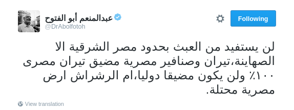 وقال -عبر تغريدة له على “تويتر”-: “لن يستفيد من العبث بحدود مصر الشرقية إلا الصهاينة”.