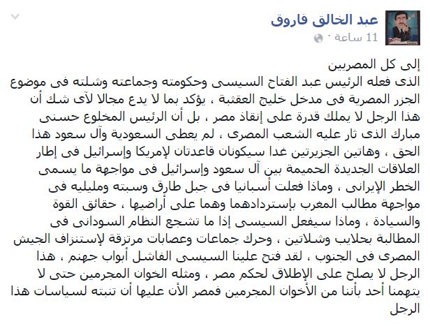استنكر الخبير الاقتصادي، عبدالخالق فاروق، قرار ضم جزيرتي “تيران وصنافير” إلى المملكة العربية السعودية.