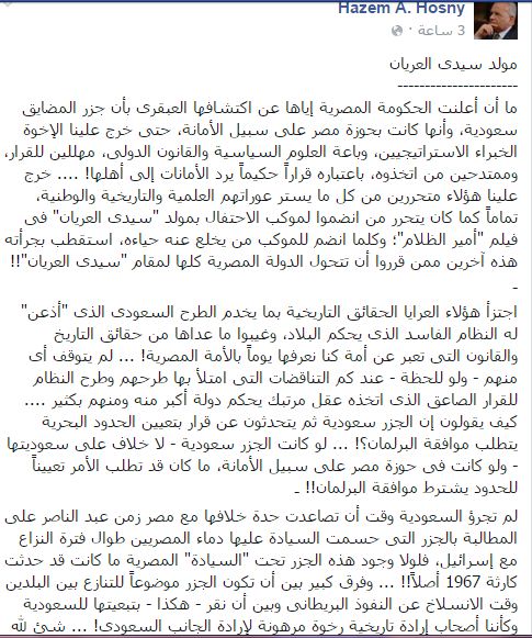 عن أزمة “تيران وصنافير”.. حسني: العرايا يجتزءون التاريخ لصالح السعودية
