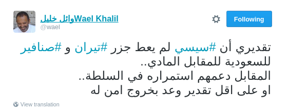 يرى الناشط اليساري، وائل خليل، أن عبدالفتاح السيسي تنازل عن جزيرتي تيران وصنافير للمملكة العربية السعودية، مقابل ضمان استمراره في السلطة.