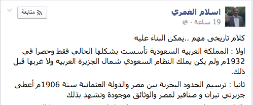 وعلق إسلام الغمري الأمين العام للمنتدي السياسي الدولي عضو الهيئة العليا لحزب البناء والتنمية خلال منشور عبر صفحته على “فيس بوك”، قائلًا: أولا: المملكة العربية السعودية تأسست بشكلها الحالي فقط وحصرا في 1932م ولم يكن يملك النظام السعودي شمال الجزيرة العربية ولا غربها قبل ذلك.