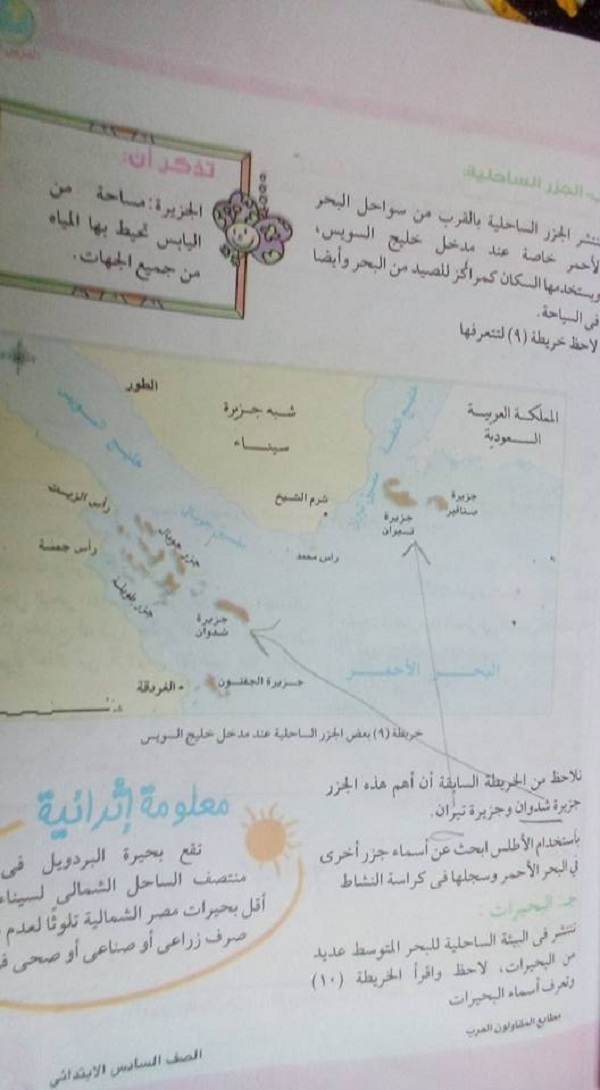 وتداول رواد مواقع التواصل الاجتماعي صورًا لخريطة مصر بالصف السادس الابتدائي بمنهج الجغرافيا، توضح وجود جزيرتي صنافير وتيران ضمن الجزر المصرية في خليج العقبة.