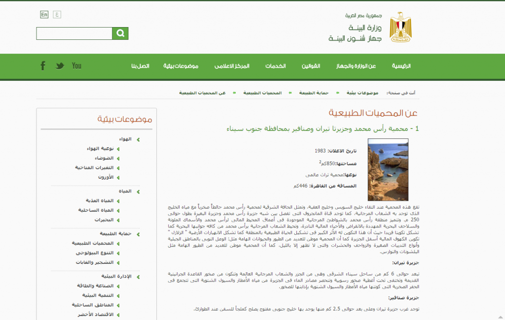 واعترف موقع وزارة البيئة الرسمي بأن محمية رأس محمد المصرية بها “جزيرتا تيران وصنافير” تابعتان لمحافظة جنوب سيناء، وعرّف الموقع “جزيرة تيران” بأنها تبعد نحو 6 كم من ساحل سيناء الشرقي وهي من الجزر والشعاب المرجانية العائمة وتتكون من صخور القاعدة الجرانيتية القديمة وتختفي تحت أغطية صخور رسوبية.
