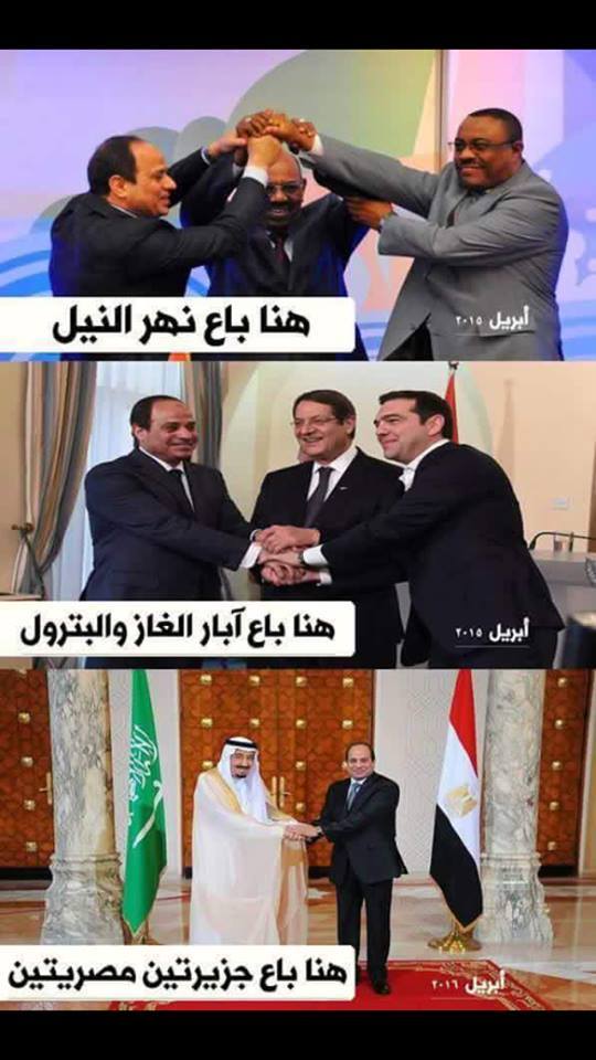 بعد إعلان السفير المصري، حسام القاويش، المتحدث الرسمي باسم رئاسة الوزراء، أنه تم عقد لجان لترسيم الحدود بين مصر والمملكة العربية السعودية، وتم وضع جزيرتي صنافير وتيران ضمن الحدود السعودية؛ لوقوعهما في المياه الإقليمية للمملكة، بحسب بيان الحكومة، تم تداول العديد من الكوميكسات الساخرة المعبرة عن رفض القرار.