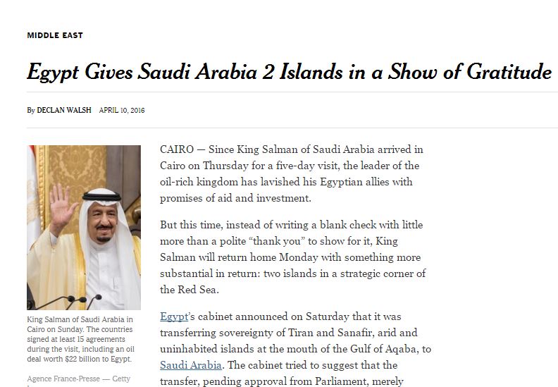رأت صحيفة “نيويورك تايمز” الأميركية أن السيسي قد منح السعودية جزيرتي “تيران” و”صنافير” للسعودية كنوع من رد الجميل للسعودية التي دعمته بـ12 مليار دولار منذ قيامه بانقلاب عسكري في 2013، حسب وصف الصحيفة.
