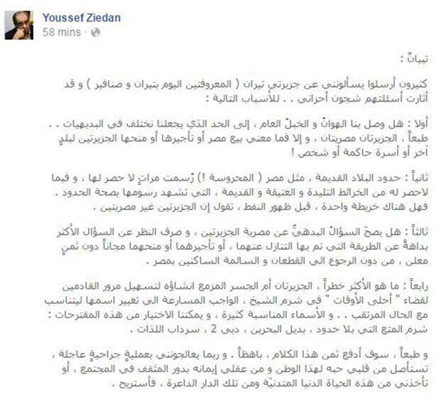 وكتب “زيدان”، عبر منشور على حسابه على موقع “فيس بوك”: حدود البلاد القديمة، مثل مصر (المحروسة !) رُسمت مراتٍ لا حصر لها، وفيما لاحصر له من الخرائط التليدة والعتيقة والقديمة، التي تشهد رسومها بصحة الحدود، فهل هناك خريطة واحدة، قبل ظهور النفط، تقول إن الجزيرتين غير مصريتين.