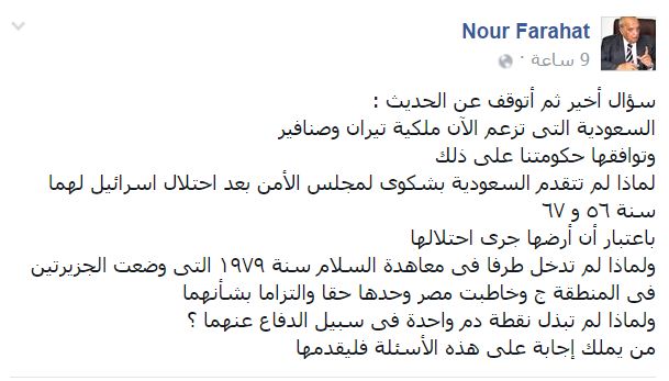 أعرب الفقيه الدستوري، نور فرحات، عن دهشته من زعم السعودية ملكية تيران وصنافير، على الرغم من أنها لم تتقدم بشكوى لمجلس الأمن بعد احتلال إسرائيل لهما سنة 56 و67 باعتبار أن أرضها جرى احتلالها.