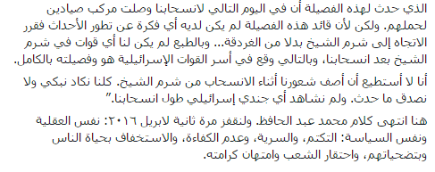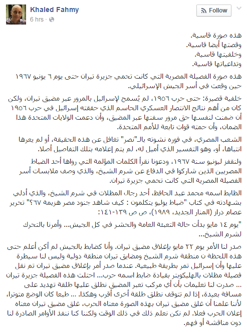 تابع “ولنقفز ليونيو سنة ١٩٦٧، ودعونا نقرأ الكلمات المؤلمة التي رواها أحد الضباط المصريين الذين شاركوا في الدفاع عن شرم الشيخ، والذي وصف ملابسات أسر الفصيلة المصرية التي كانت تحمي جزيرة تيران.. الضابط اسمه محمد عبد الحافظ، أحد رجال المظلات في شرم الشيخ، والذي أدلى بشهادته في كتاب (ضباط يوليو يتكلمون: كيف شاهد جنود مصر هزيمة ٦٧؟، تحرير عصام دراز، المنار الجديد، ١٩٨٩، صـ١٣٩-١٤١)”.