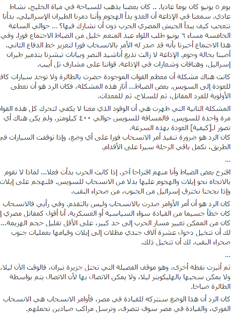 وأضاف: “وفي حدود الساعة الخامسة مساء ٦ يونيو، طلب اللواء عبد المنعم خليل من الضباط الاجتماع فورًا، وفي هذا الاجتماع أخبرنا بأنه قد صدر له الأمر بالانسحاب فورًا لتعزيز خط الدفاع الثاني، أصبنا بحالة وجوم، الإذاعة ما زالت تذيع أناشيد النصر وبيانات تبشرنا بتدمير طيران إسرائيل، وهتافات وشعارات في الإذاعة، قواتنا على مشارف تل أبيب، كانت هناك مشكلة أن معظم القوات الموجودة حضرت بالطائرة ولا توجد سيارات كافية للعودة إلى السويس، بعض الضباط، أثار هذه المشكلة، فكان الرد هو أن تعطى الأولوية للفرد المقاتل، ثم للسلاح، ثم للمعدات”.