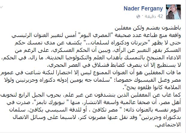 وأضاف “فرجاني” -عبر منشور له على “فيس بوك”- أن تغيير مانشيت “المصري اليوم” يبين أن “الحكم العسكري -على الرغم من الادعاء المتبجح بالتمسك بأهداب العلم والتكنولوجيا الحديثة- ما زال، في الحكم، لا يستطيع إلا أن يتصرف كضابط قشلاق في العصر الحجري”.