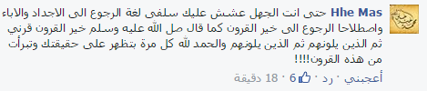 -Hhe: “حتى انت الجهل عشش عليك سلفي لغة الرجوع إلى الأجداد والآباء واصطلاحًا الرجوع إلى خير القرون كما قال صلى الله عليه وسلم: خير القرون قرني ثم الذين يلونهم ثم الذين يلونهم. والحمد لله كل مرة بتظهر على حقيقتك وتبرأت من هذه القرون”.