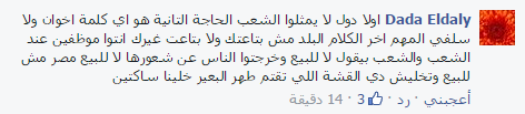 -Dada: “أولًا دول لا يمثلوا الشعب، الحاجة التانية هو أي كلمة إخوان ولا سلفي المهم آخر الكلام البلد مش بتاعتك ولا بتاعت غيرك انتوا موظفين عند الشعب والشعب بيقول لا للبيع وخرجتوا الناس عن شعورها لا للبيع مصر مش للبيع ومتخليش دي القشة اللي تقصم ظهر البعير خلينا ساكتين”.