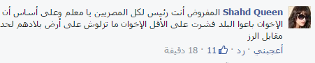 -Shahd: “المفروض أنت رئيس لكل المصريين يا معلم وعلى أساس أن الإخوان باعوا البلد على الأقل الإخوان ما اتنزلوش على أرض بلادهم لحد مقابل الرز”.