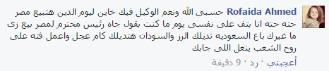 -Rofaida: “حسبي الله ونعم الوكيل فيك خاين ليوم الدين هتبيع مصر حته حته انا بتف على نفسي يوم ما كنت بقول جه رئيس محترم لمصر بيع زي ما غيرك باع السعودية تديلك الرز والسودان هتديلك كام عجل واعمل فتة على روح الشعب….”.