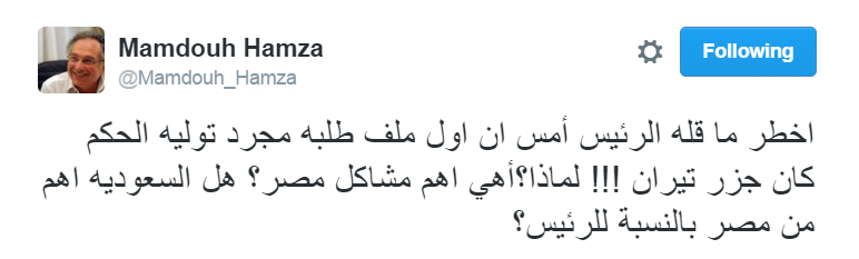 وقال -عبر تغريدة له على “تويتر”-: “أخطر ما قاله الرئيس أمس إن أول ملف طلبه مجرد توليه الحكم كان جزر تيران! لماذا؟ أهي أهم مشاكل مصر؟ هل السعودية أهم من مصر بالنسبة للرئيس؟”.