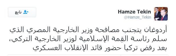 Hamze Tekin: “أردوغان يتجنب مصافحة وزير الخارجية المصري الذي سلم رئاسة القِمة الإسلامية لوزير الخارجية التركي، بعد رفض تركيا حضور قائد الانقلاب العسكري”.