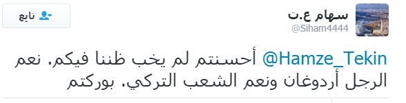 :Siham “أحسنتم لم يخب ظننا فيكم. نعم الرجل أردوغان ونعم الشعب التركي. بوركتم”.