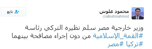 محمود علوش: “وزير خارجية مصر سلم نظيره التركي رئاسة القمة الإسلامية من دون إجراء مصافحة بينهما”.