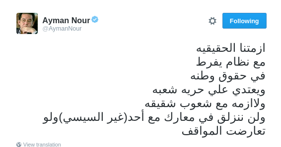 قال الدكتور أيمن نور رئيس حزب غد الثورة، إن توحّد الشعب المصري في تظاهرات غد الجمعة؛ احتجاجًا على ضم جزيرتي تيران وصنافير للمملكة العربية السعودية، هو من أجل وحدة الوطن وسلامة أرضه.
