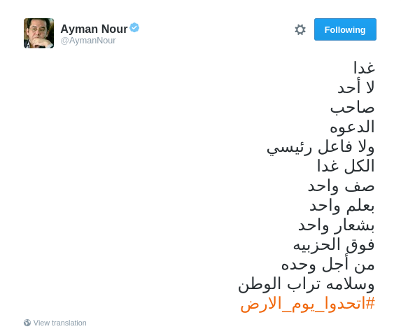 وقال في تغريدة له عبر حسابه على موقع التواصل الإجتماعي “تويتر”: “غدًا لا أحد صاحب الدعوة ولا فاعل رئيسي، الكل غدًا صف واحد بعلم واحد بشعار واحد، فوق الحزبية من أجل وحدة وسلامة تراب الوطن”.