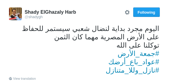 وقال الناشط السياسي شادي الغزالي حرب عبر “تويتر”: “اليوم مجرد بداية لنضال شعبي سيستمر للحفاظ على الأرض المصرية مهما كان الثمن، توكلنا على الله، جمعة الأرض”.