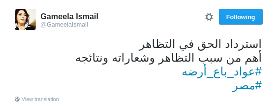 وكتبت الإعلامية جميلة إسماعيل عبر “تويتر”: “استرداد الحق في التظاهر، أهم من سبب التظاهر وشعاراته ونتائجه.. عواد باع أرضه”.