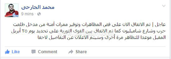 وكان عدد من النشطاء على مواقع التواصل “فيس بوك” أكدوا أنه تم الاتفاق مع قوات الداخلية، على انتهاء المظاهرات بمحيط نقابة الصحفيين مع تأمين ممرات لخروجهم، وتحديد يوم 25 أبريل الجاري للتظاهر مرة أخرى.