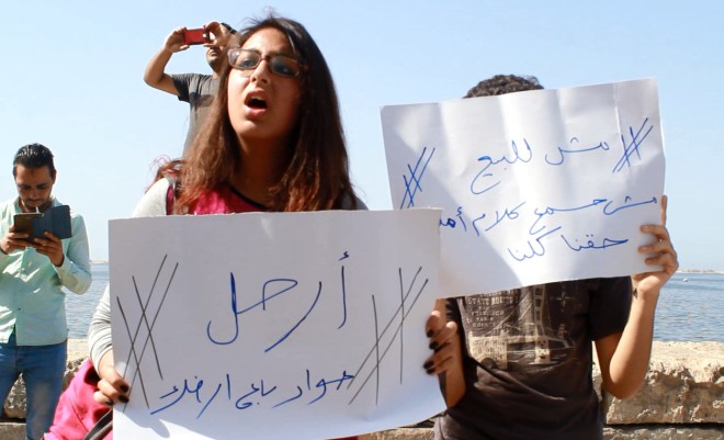رفع المشاركون في التظاهرات عدة لافتات، منها: “عواد باع أرضه”، “ارحل يا سيسي”، “القرار قرار الشعب”.