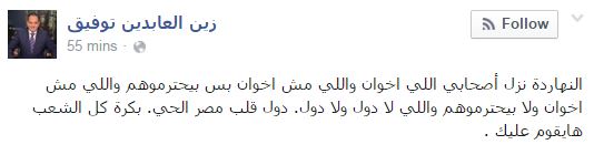 البداية كانت مع الإعلامي والمذيع بقناء “الجزيرة” الفضائية القطرية زين العابدين توفيق، الذي علّق قائلًا: “النهاردة نزل أصحابي اللي إخوان واللي مش إخوان بس بيحترموهم واللي مش إخوان ولا بيحترموهم واللي لا دول ولا دول.. دول قلب مصر الحي.. بكرة كل الشعب هايقوم عليك”.