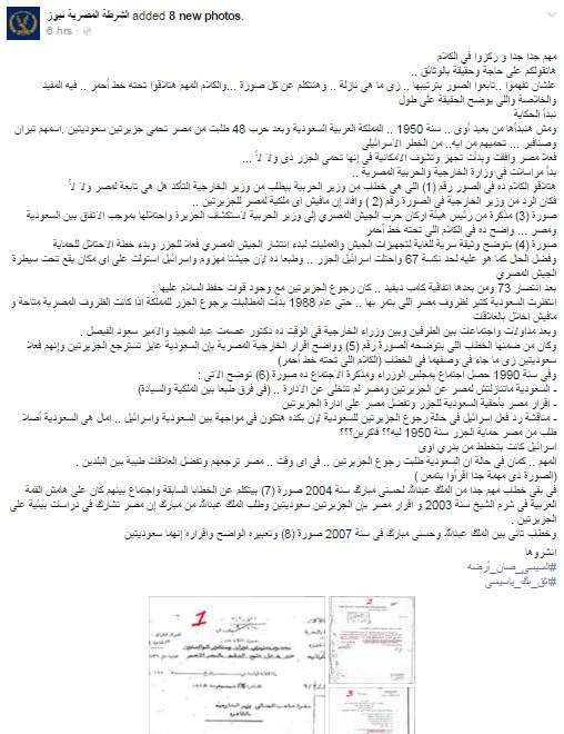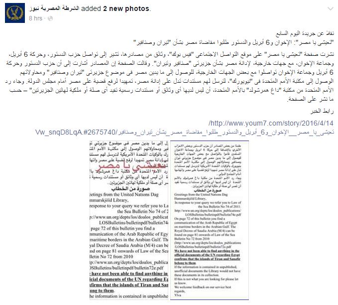 وأصدر مجلس الوزراء بيانا، مساء السبت الماضي، مبينًا أن رسم خط الحدود بناءً على المرسوم الملكي والقرار الجمهوري أسفر عن وقوع جزيرتي صنافير وتيران داخل المياه الإقليمية للمملكة العربية السعودية.