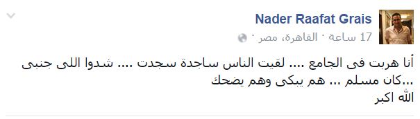 أكد نادر رفعت جريس “مسيحي”، أحد الشباب المتظاهرين في جمعة “الأرض والعرض”، أمس الجمعة، أنه دخل أحد المساجد، وسجد؛ حتى لا تلحق به قوات الأمن.