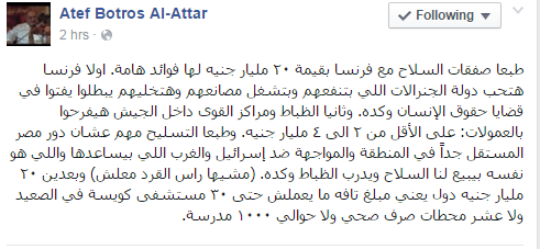 وقال العطار عبر منشور له على حسابه بموقع التواصل الاجتماعي أن “صفقات السلاح مع فرنسا بقيمة ٢٠ مليار جنيه لها فوائد هامة”.
