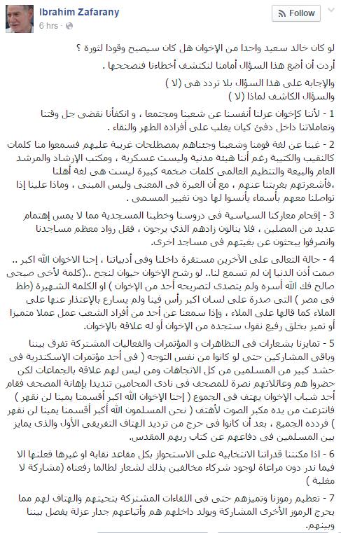 وذكر الزعفراني عبر حسابه بموقع التواصل الاجتماعي فيس بوك أسباب عزلة جماعة الإخوان المسلمين في 9 نقاط كالتالي: