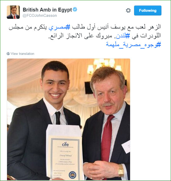وكتب “كاسن”، عبر حسابه الشخصي بموقع التواصل الاجتماعي “تويتر”: “الزهر لعب مع يوسف أنيس، أول طالب مصري يتكرم من مجلس اللوردات في لندن، مبروك على الإنجاز الرائع، وجوه مصرية ملهمة”.