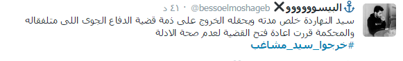 وغرد بيسو: “سيد النهارده خلص مدته، ويحق له الخروج على ذمة قضية الدفاع الجوي اللي متلفقة له، والمحكمة قررت إعادة فتح القضية لعدم صحة الأدلة”.