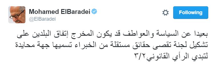 أكد الدكتور محمد البرادعي، المدير الأسبق لوكالة الطاقة الذرية، تعليقا على أزمة “تيران وصنافير”، أن “العلاقة بين السعودية ومصر وبين الشعبين أهمّ وأبقى من أن تتأثر بخلاف قانوني ناتج عن تفسيرات مختلفة للوقائع التاريخية والوثائق القانونية”.