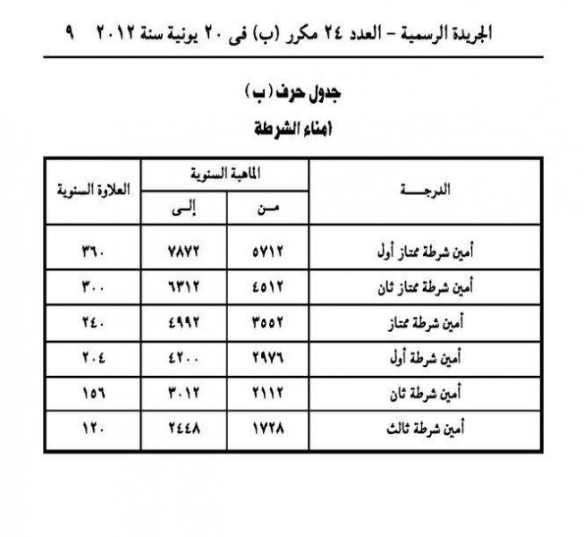 وأوضح البيان الذي نشر في الجريدة الرسمية للدولة بتاريخ 20 يونيه 2012، حسب الدرجة أن أمين شرطة ممتاز أول كانت الماهية السنوية له تتراوح بين 5712 : 7872 وكانت العلاوة السنوية هي 360 جنيها.