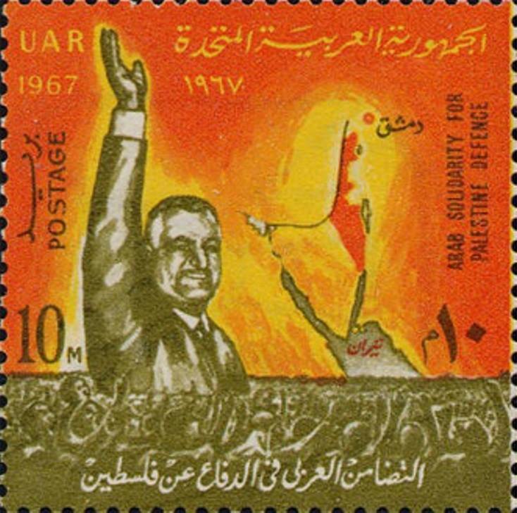 تحت شعار “التضامن العربي في الدفاع عن فلسطين”، صدر الطابع الذي تظهر فيه خريطة فلسطين تعانق الحدود المصرية، كما تظهر داخله إشارة لـ”دمشق”، في تأكيد على تضامن “الجمهورية العربية المتحدة” آنذاك، مع القضية الفلسطينية.