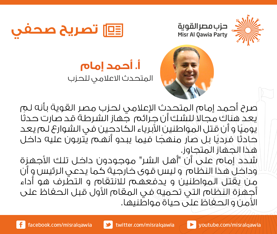 أكد أحمد إمام، المتحدث الإعلامي باسم حزب مصر القوية، أن جرائم جهاز الشرطة صارت حدثًا يوميًا، وأن قتل المواطنين الأبرياء الكادحين في الشوارع لم يعد حادثًا فرديًا بل صار منهجًا في ما يبدو أنهم يتربون عليه داخل هذا الجهاز المتجاوز.