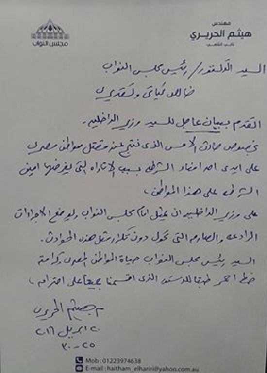 تقدم النائب هيثم الحريري، ببيان عاجل إلى الدكتور علي عبدالعال، رئيس مجلس النواب؛ بخصوص حادث الأمس، الذي نتج عنه مقتل مواطن مصري على أيدي أحد أمناء الشرطة، مطالبًا بمثول وزير الداخلية أمام النواب؛ لوضع الإجراءات الصارمة التى تحول دون تكرار هذه الحوادث مرة أخرى.