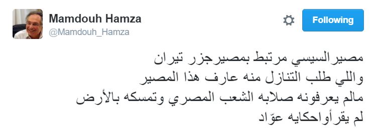 اعتبر الخبير الهندسي والناشط السياسي ممدوح حمزة استمرار عبدالفتاح السيسي في الحكم مرتبطًا بقرار التنازل عن جزيرتي “تيران وصنافير” للسعودية.